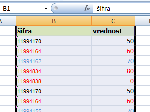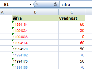 ![]() Tabela bo sedaj sortirana na podlagi barve pisave, pri čemer se bodo podatki izbrane barve nahajali na vrhu. |