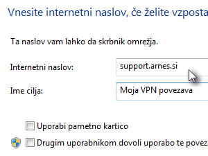 V polje Internetni naslov vpišite domenski naslov ali naslov IP strežnika, na katerem je vzpostavljen VPN strežnik.