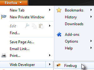 Sedaj kliknite na gumb Firefox in izberite Web Developer -> Firebug.