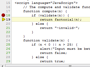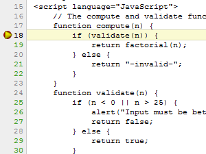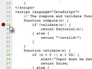 Na levi strani so številke vrstic, od katerih so nekatere obarvane zeleno, kar pomeni, da lahko na tem mestu ustavite izvajanje kode. Kliknite na številko 18, da se zraven pojavi rdeč krogec. |