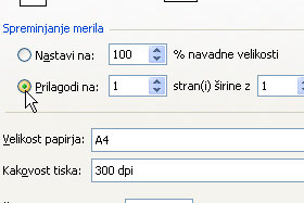 Potem pa v polju Spreminjanje merila določite Prilagodi na 1 strani(i) širine z 1 višine (glej sliko).