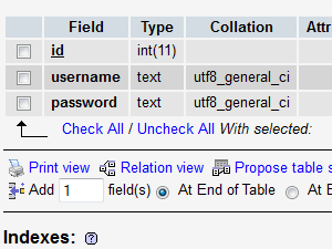 Ustvarili smo novo tabelo, v katero smo dodali polja id ter username in password.