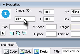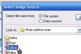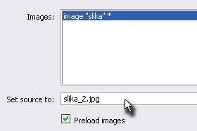 Odpre se okno Swap Image. V polju Images označite sliko slika (ki ste je prij imenovali v oknu Propreties). V polju Set source to pa preko gumba Browse določite sliko, ki želite da se zamenja, ko boste nad označenim tekstom. Preload images naj ostane označeno in kliknite na gumb OK. |