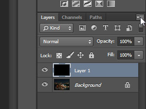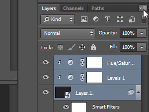 ![]() Nov layer se bo zapolnil s črno barvo. Kliknite zgoraj na več možnosti v paleti layerjev (glej sliko) in izberite Convert to Smart Object. |