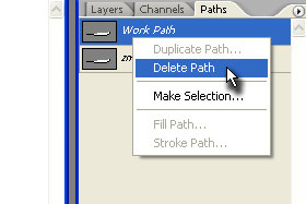 Označite Work Path, kliknite nanj z desnim miškinim gumbom in izberite Delete Path. Pobrisali ste prej ustvarjeno pot (črte). Kliknite nazaj na zavihek Layers. |