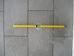 Na suho položimo zaključno keramično ploščico - levo in desno - odmerimo enako razdaljo od zidu in napnemo linijsko vrvico.