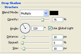 Pojavi se okno za določanje sence layerja. Blend Mode naj bo določeno Multiply, barva črna in Opacity 75 %. Distance določite 10 px, Spread 5 % in Size 10 px. Seveda lahko te nastavitve določate poljubno. Ne zaprite še okna... |