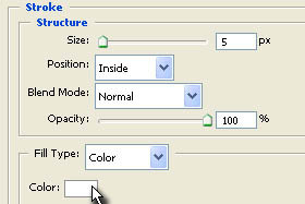Prikažejo se nastavitve za rob layerja. Size določite 5 px, Position Inside in spodaj kliknite na izbrinik barve in nastavite belo barvo. Seveda pa lahko vse te nastavitve določate poljubno. Kliknite na gumb OK. |