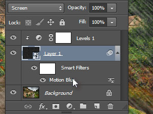 ![]() Sedaj boste v praksi videli, kaj pomenijo pametni filtri (korak 7). Kliknite dvakrat na filter Motion Blur v paleti layerjev (glej sliko).