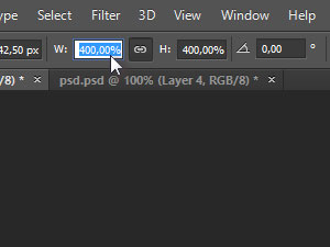 ![]() Sedaj bomo efekt razpotegnili. Kliknite zgoraj na Edit in izberite Free Transform. Nato pa zgoraj v orodni vrstici nastavite polje za širino in višino na 400% (glej sliko) in potrdite spremembe s tipko Enter.