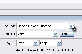 V oknu Properties v polju Sound preko izbirnika določite prej uvoženo glasebno datoteko.