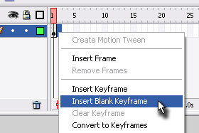 Označite Frame 1 tega layerja. Kliknite nanj z desnim miškinim gumbom in izberite Insert Blank Keyframe. |