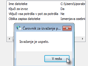 ![]() V kolikor je bil izvoz uspešen, boste dobili izpisano sporočilo Izvažanje je uspelo. |