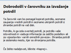 ![]() Odprl se vam bo čarovnik za izvažanje potrdil, ki vas bo vodil čez celotni postopek. |