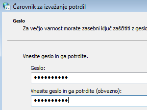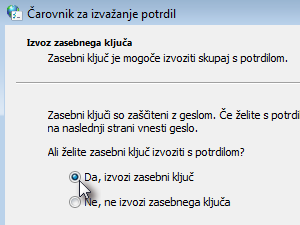 ![]() Označite, da želite izvoziti tudi zasebni ključ, saj boste le na ta način shranili certifikat v celoti. |