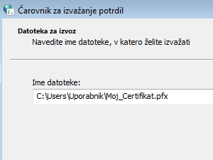 ![]() Na koncu še izberite ime in lokacijo datoteke, kamor se bo certifikat izvozil. |