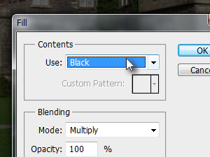 ![]() Nato pa kliknite zgoraj na Edit in izberite Fill... V novem oknu Use preko izbirnika določite Black in kliknite na gumb OK. |