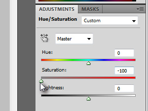 ![]() Tokrat bomo fotografiji odvzeli barve, da bo efekt še bolj realističen. Kliknite zgoraj na Layer, New Adjustment Layer in izberite Hue/Saturation... Ko se pojavi pogovorno okno, pustite privzeto ime in kliknite na gumb OK. Nato pa nastavite Saturation na -100 (glej sliko). |