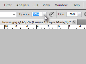![]() Zgoraj določite Opacity na 30% (glej sliko). S tem smo zmanšali moč čopiča na tretjino. |