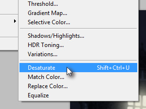 ![]() Kliknite zgoraj na Image, Adjustments in izberite Desaturate. Ta ukaz vzame barve in naredi layer črno beli.