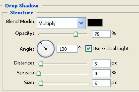 Odpre se okno za nastavljanje sence. Angle nastavite 130 stopinj. Distance nastavite 5 px, Spread 0 % in Size 5 px. Seveda pa lahko nastavljate senco po želji. Kliknite na gumb OK. |