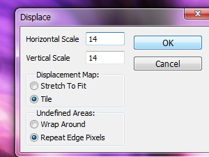 ![]() Kliknite zgoraj na Filter, Distort in izberite Displace... V novem oknu nastavite iste vrednosti kot jaz in kliknite na gumb OK. |