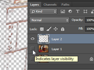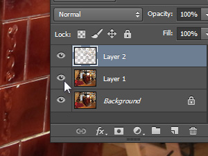 ![]() Označitev oziroma selekcija naj bo še vedno aktivna. Pritisnite tipki Ctrl (Command na MacOS) in J skupaj, da duplicirate označeno v nov layer. Potem pa izklopite vidljivost spodnjima layerjema (glej sliko), da boste videli samo layer, katerega obdelujete. |