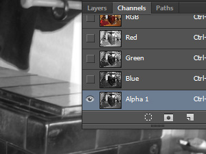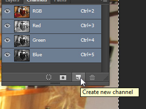 ![]() Kliknite nato na zavihek Channels. Če ga ne vidite, kliknite zgoraj na Window in izberite Channels. RGB kanal naj bo označen, pritisnite tipki Ctrl (Command na MacOS) + A in nato Ctrl (Command na MacOS) + C, da kopirate označeno Potem pa ustvarite nov kanal tako, da kliknete na Create new channel. |