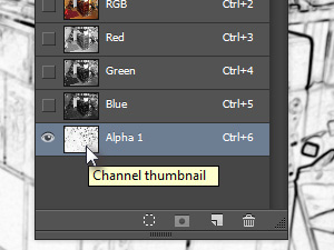 ![]() Držite tipko Ctrl (Command na MacOS) in kliknite na predogledno sličico Alpha 1 v zavihku kanalov, da ustvarite selekcijo. |