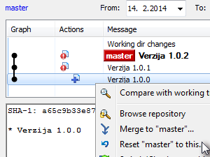 ![]() Prikazane bodo vse spremembe, ki ste jih vnesli preko ukaza Git commit. Če z desnim miškinim gumbom kliknete na eno od starejših verzij in izberete Reset to ..., pa imate možnost, da se vrnete na to verzijo. |