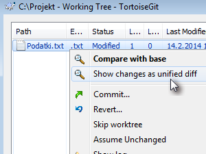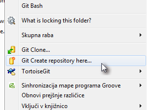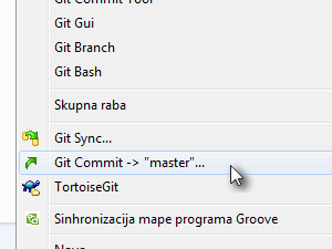 ![]() Sedaj lahko naprej delate na projektu. Ko ste naredili spremembe, zopet z desnim miškinim gumbom kliknete na prazen prostor v mapi in izberete možnost TortoiseGit -> Diff. |