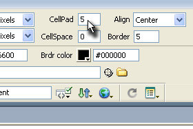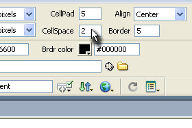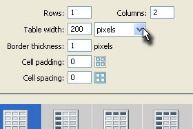 Rows določite 1 in Columns 2. To pomeni, da bomo ustvarili ena vrstico in dva stolpca. Table Width določite 200 pixels in Border thickness 1 pixels. To pomeni da bo tabela široka 200 in njen rob 1 piko. Cell padding in Cell spacing nastavite 0 in kliknite na gumb OK. |