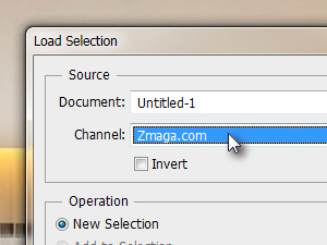 ![]() Sedaj bomo na začetku shranjeno selekcijo ponovno prikazali. Kliknite zgoraj na Select in izberite Load Selection... V novem oknu Channel izberite prej shranjeno ime ter kliknite na gumb OK. |
