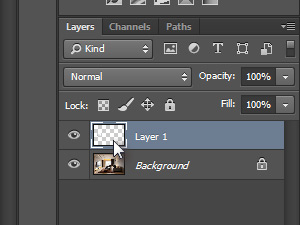 ![]() Pritisnite tipki Ctrl (Command na MacOS) in J, da boste označeno duplicirali v nov layer. Potem pa ponovno držite tipko Ctrl (Command na MacOS) in kliknite na malo sličico novega layerja, da ustvarite selekcijo. |