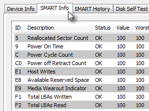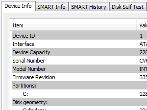 ![]() Na prvem zavihku Device Info si lahko ogledate nekaj splošnih tehničnih specifikacij o vašem disku. |