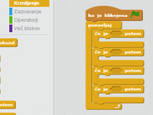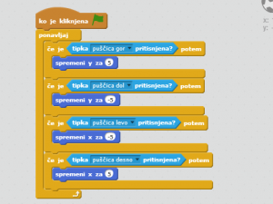 ![]() Dobro je vedeti, da položaj X predstavlja premikanje levo in desno, položaj Y pa premikanje gor in dol. In znak - pred številko pomeni nasprotno smer (levo, dol). Torej v zanko, ki detektira puščico gor vstavite: [spremeni y za 5] puščico dol vstavite: [spremeni y za -5] puščico levo vstavite: [spremeni x za -5] puščico desno vstavite: [spremeni x za 5] Številka na koncu ukaza pove, za koliko korakov se bo figura premaknila, torej hitrost premikanja. |