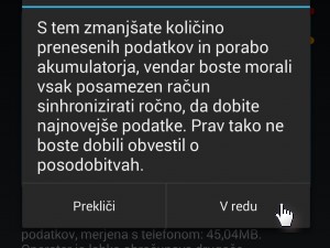 ![]() Prikaže se obvestilo, da bo s tem zmanjšana količina prenesenih podatkov in porab akumulatorja, vendar pa boste morali podatke od sedaj naprej sinhronizirati ročno.