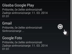 ![]() Prikaže se seznam Googlovih storitev, pri katerih je možna sinhronizacija. Če kliknete na posamezno storitev, s tem izvedete ročno sinhhronizacijo. |