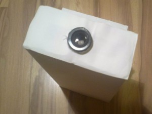 ![]() V sprednjo stran škatle vstavite objektiv ali lečo. (Večja kot je leča bolj svetla bo slika, ker bo tako več svetlobe zapustilo škatlo torej naj bo leča čim večja.) |