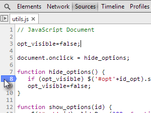 ![]() V kolikor pri določeni vrstici programske kode kliknemo ob desnem robu. Na ta način dosežemo, da se bo izvajanje funkcije na tem mestu ustavilo. S tem lahko točno preverimo, kaj se dogaja pri izvajanju funkcije. |