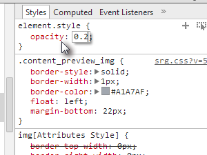 ![]() V prejšnjem koraku sem spremenil prosojnost slike (opacity) in kot opazimo, so spremembe na strani vidne takoj in ni potrebno ponovno nalaganje strani. Razvijalci spletnih strani na ta način hitro testirajo razne oblikovne možnosti in jih prenesjo v dejansko kodo šele, ko so zadovoljni z rezultatom. |