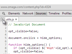 ![]() Za razvijalce je pomemben zavihek Sources, kjer si lahko ogledamo Javascript programsko kodo, ki se uporablja na strani. |