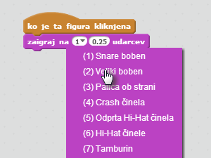 ![]() Namesto vašega zvočnega posnetka lahko figura predvaja tudi naprimer veliki boben ali zaigra noto. V Scratch lahko prenesete zvoke s svojega računalnika ali pa izberete enega ki je že naložen na Scratch. |