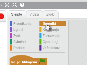 ![]() Zdaj ko imamo posnet zvok se lahko lotimo programiranja. Izberite zavihek Skripte. In se v knjižnici programskih kock pomaknite med dogodke. |
