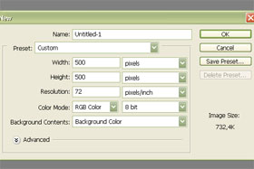 Jaz sem ustvaril dokument v velikosti 500 x 500 pikslov.