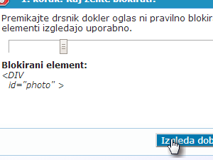 ![]() Potem kliknite na oglas, ki se ni izbrisal. Odpre se okno z drsnikom. S tem lahko zbrišetze še naprimer okvir ali napis zraven oglasa. Ko izgine oglas lahko kliknete Izgleda dobro. In tudi ko boste naslednič obiskali to stran oglase ne bo več. |