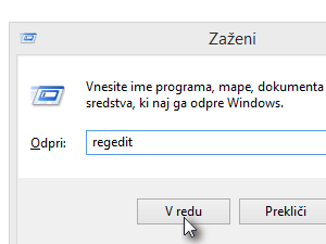 ![]() Pritisnite Win+R in v zagon vpišite regedit. Do istega učinka predete tudi če pritisnite Win+X ali kliknete z desnim klikom na Start gumb in nato kliknete na Zaženi. |