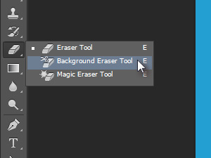 ![]() Izberite orodje Background Eraser Tool. Držite z miškon a orodju Eraser Tool (bližnjica je tipka E) toliko časa, dokler se ne prikažejo ostala orodja. |