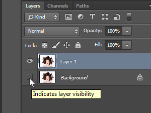 ![]() Duplicirajte layer tako, da pritisnite Ctrl (Command na MacOS) in J skupaj. Potem pa izklopite vidljivost prvotnega layerja (glej sliko). Dupliciran layer naj ostane označen (glej sliko). |