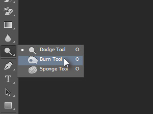 ![]() Izberite orodje Burn Tool. Držite z miško na orodju Dodge Tool (bližnjica je tipka O) toliko časa, dokler se vam ne prikažejo ostala orodja. |